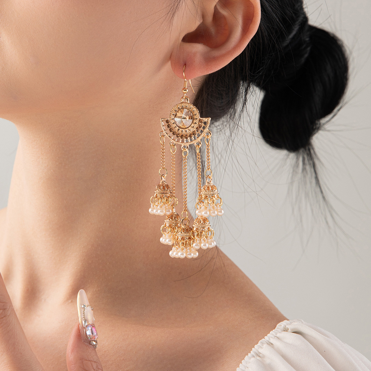 Luxury personalized micro diamond earrings retro women's long luxury imitation big stone bell Pearl tassel earrings