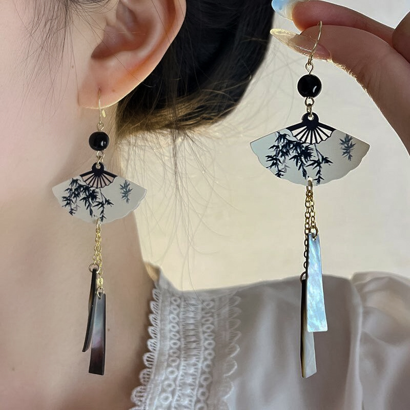 New Chinese Style Retro Trendy Fan-shaped Ink Bamboo Tassel Earrings Women's 2024 New Explosive Fashionable Elegant Antique Earrings