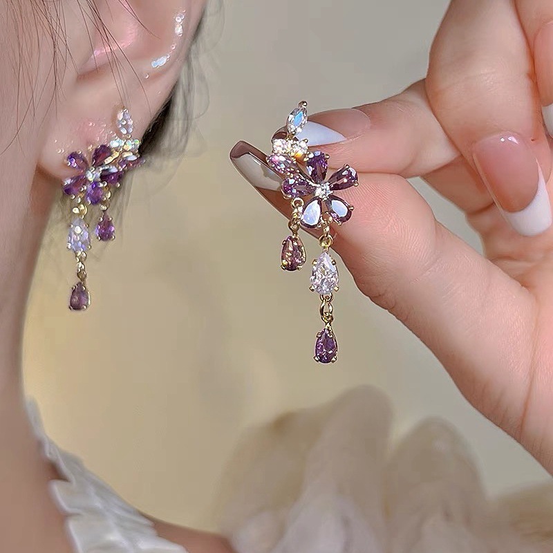 Purple Flower Zircon Tassel Earrings for Women, Fashionable, High-End, Sweet and Gentle Wedding Versatile Earrings Wholesale