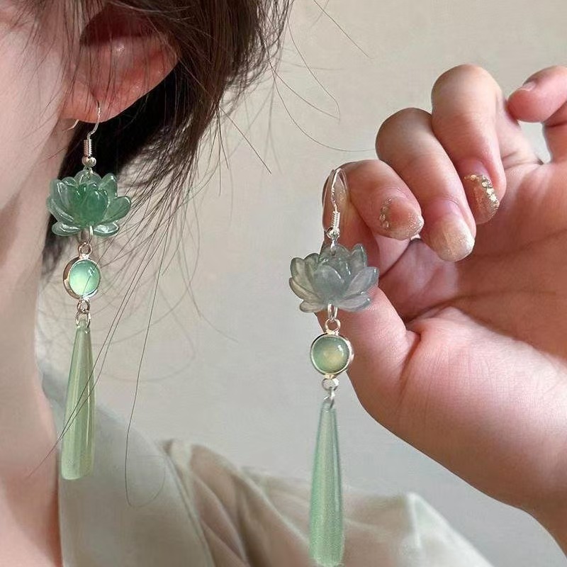 Step by Step New Chinese Lotus Cat's Eye Stone Long Water Drop Earrings Women's National Style Hanfu Antique Ear Hook Ear Jewelry