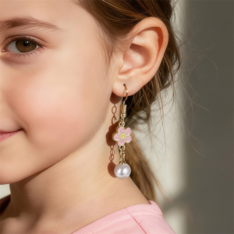 Cross-Border Pearl Flower Children's Jewelry Set Cute Little Girl Alloy Oil Drop Flower Long Earrings for Women