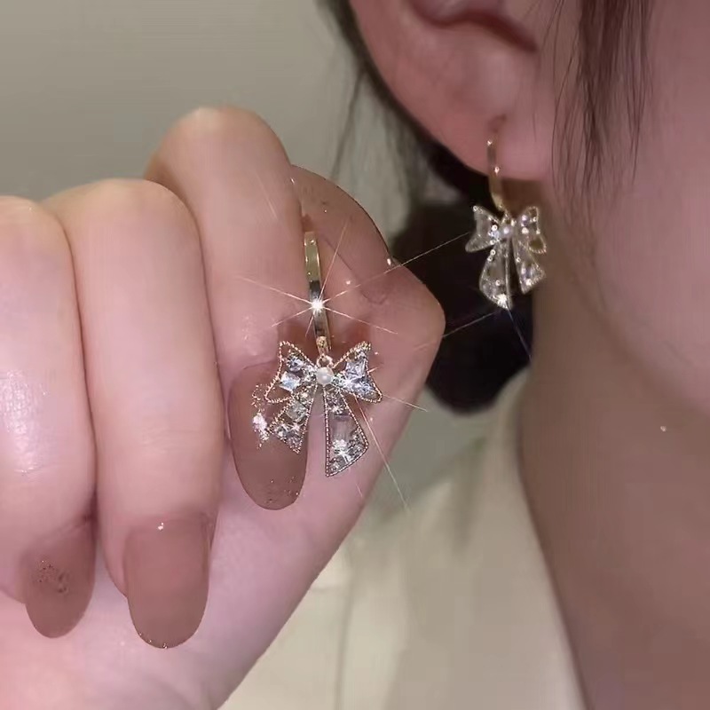 Korean popular flash diamond ear buckle super fairy temperament girl sweet bow earrings design hollow earrings wholesale