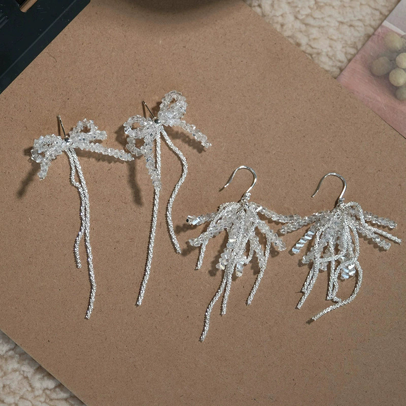 Korean Style Ice-Transparent Beaded Bow Earrings for Women, Niche High-End Tassel Earrings, Versatile Girly Earrings