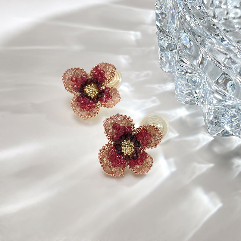Nostalgic Hong Kong style retro red and white plaid flower earrings antique sense playful girl cute Japanese ear clip earrings