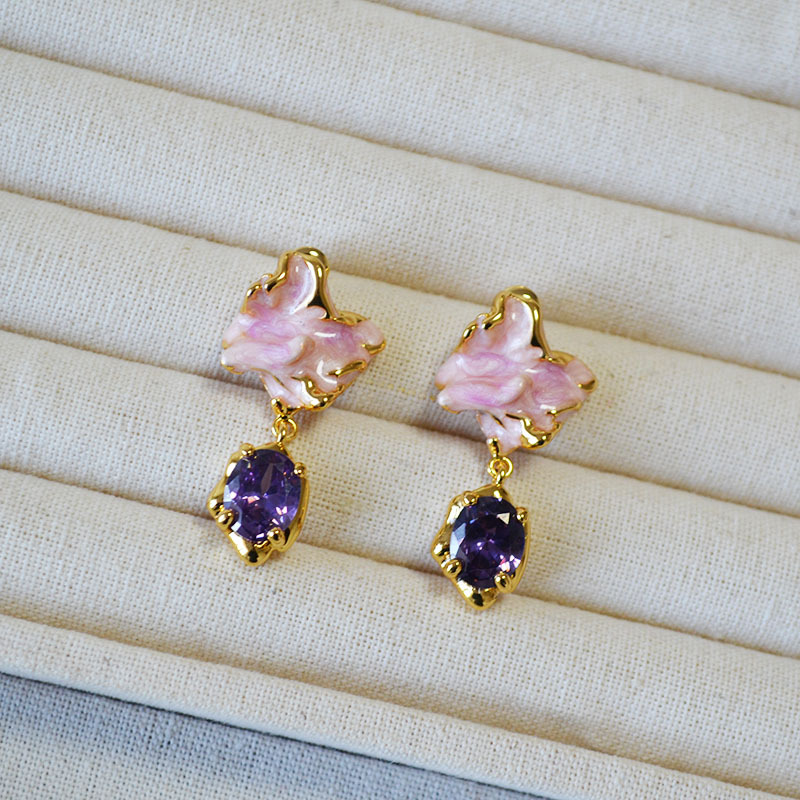 French Sweet Niche Design Pink Enamel Flower Purple Zircon Simple Elegant 925 Silver Pin Earrings Earrings