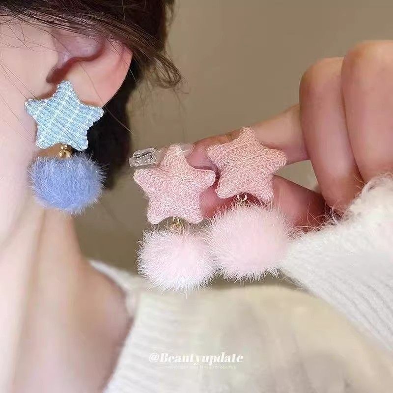 Autumn and winter five-angle stars pink blue mink fur ball earrings women's new heart furry sweet cute earrings
