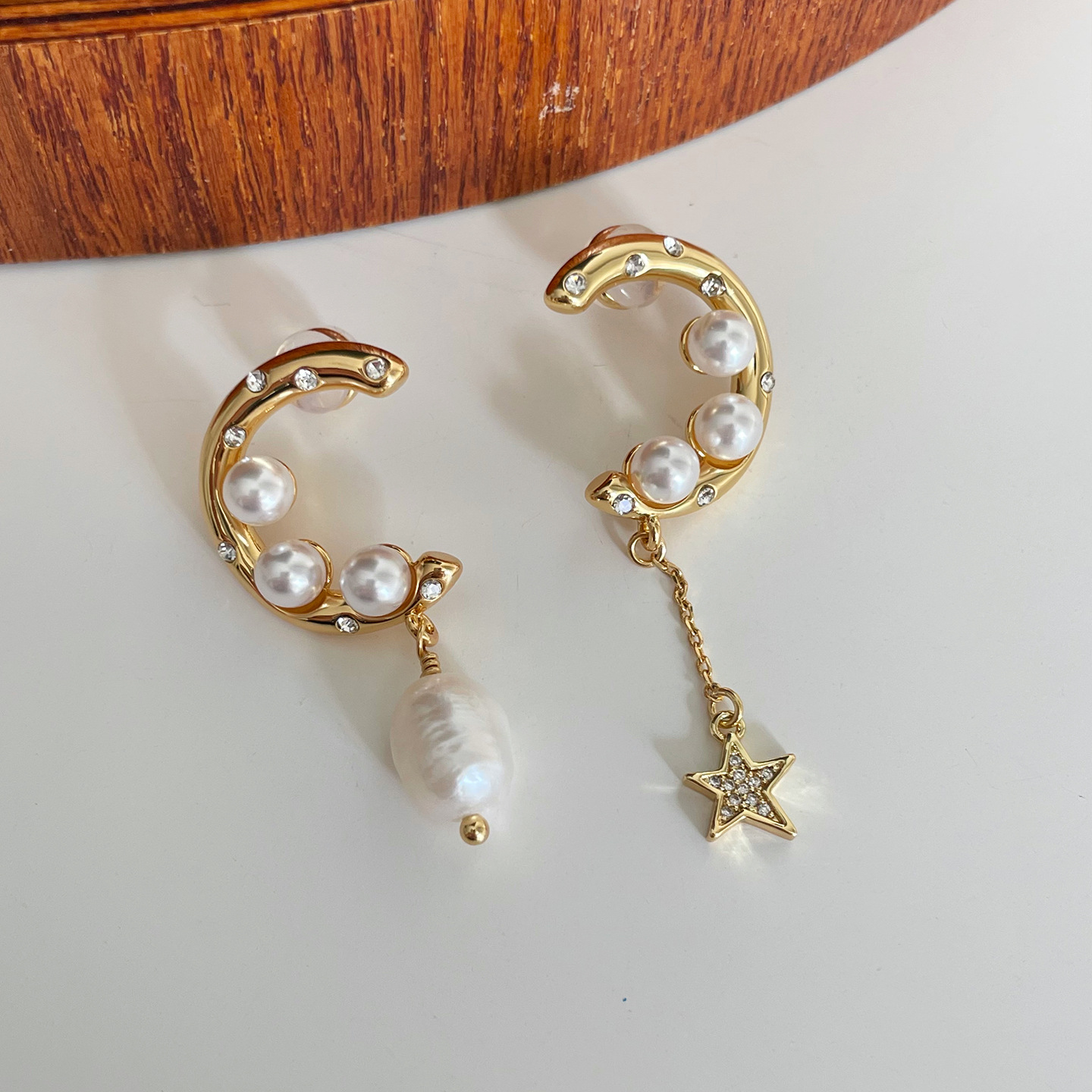 Sweet Asymmetric Moon Pearl Earrings Tassel Stars Unique Qingdao Foreign Trade Jewelry Wholesale Niche Earrings for Women