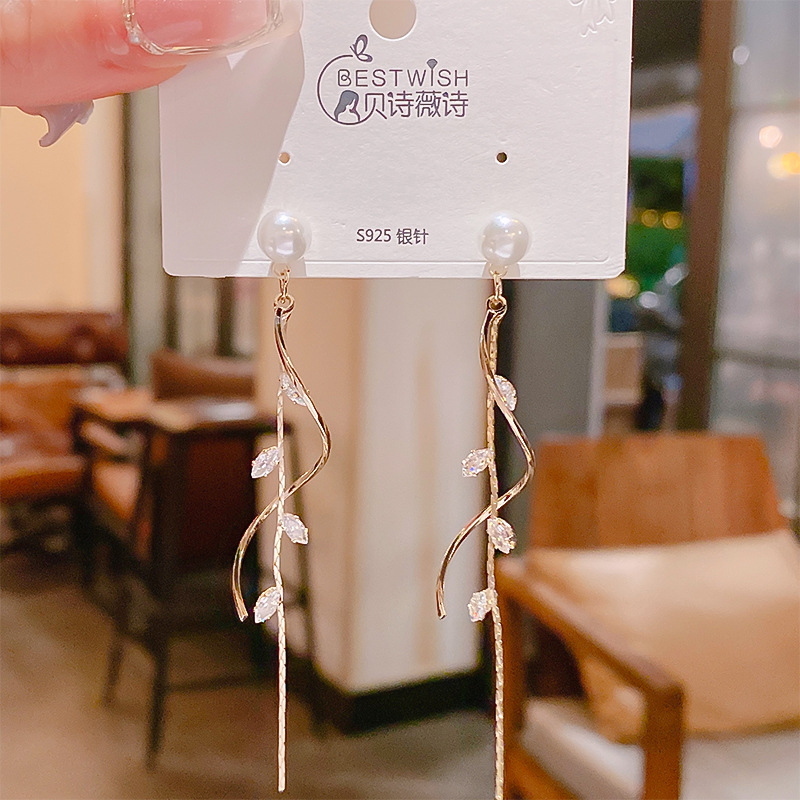 Slightly Sweet Girl Shiny Leaf Pearl Earrings Long Tassel High-End Design Earrings