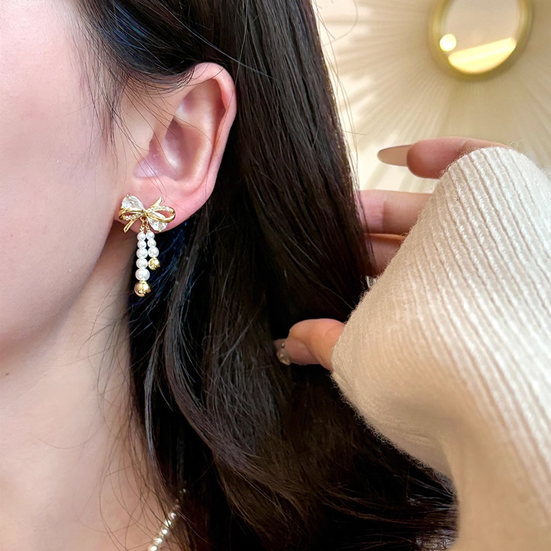Korean Style Niche Design, Exquisite, Elegant and Versatile Earrings, Sweet Zircon Pearl Bow Tassel Earrings for Women
