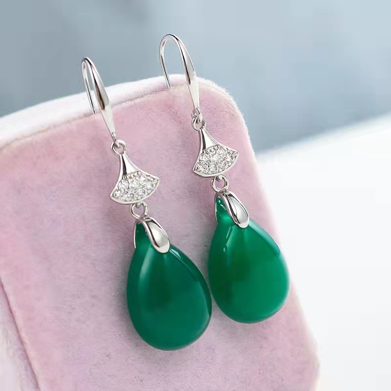 【Imitation Chalcedony Green Agate】Long Earrings with Zircon Inlay for Women, Vintage Gemstone Ear Hooks, Trendy Tassel Earrings