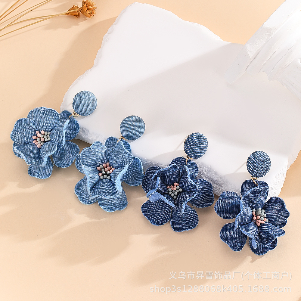 Flower Earrings, Fabric Camellia, Blue Floral Style, Fresh and Sweet, Denim, Girly Style, Fashionable and Versatile