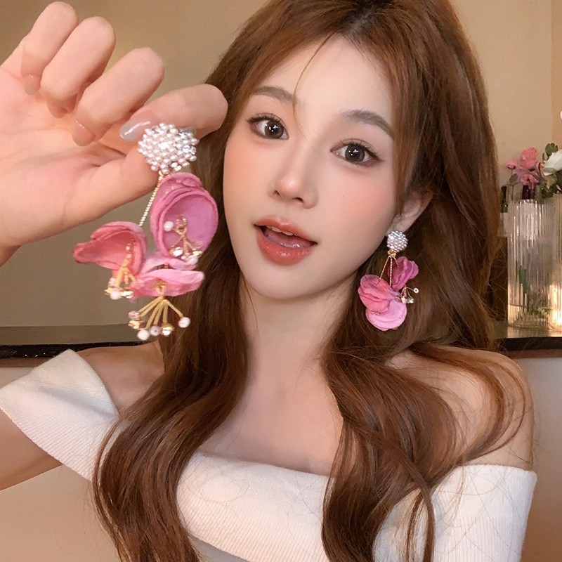 New South Korea vintage baroque pink crystal lovely tassel earrings long elegant sweet silver needle earrings