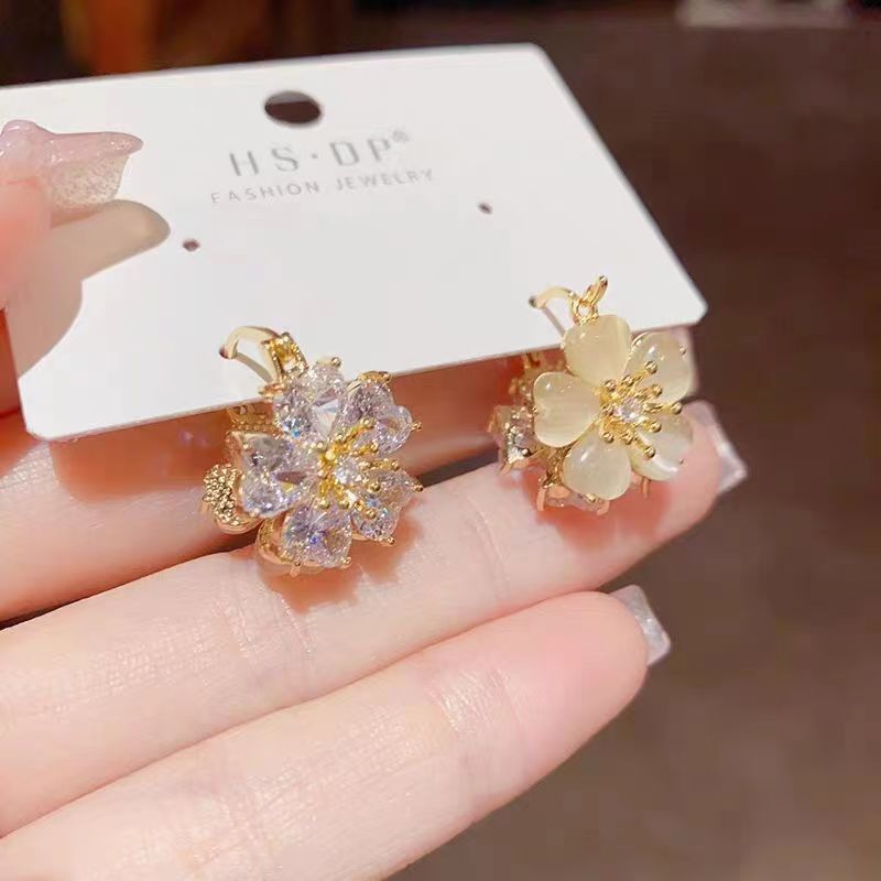 S925 Silver Needle Double Flower lotus pond moonlight flower double-sided wear sweet personality Cat Eye Ear buckle female niche earrings