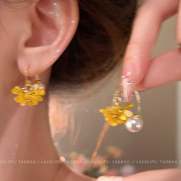 Super Fairy Osmanthus Fringed Pearl Earrings Women's Sweet and Gentle Niche Earrings French Retro All-match Face Skinny Earrings