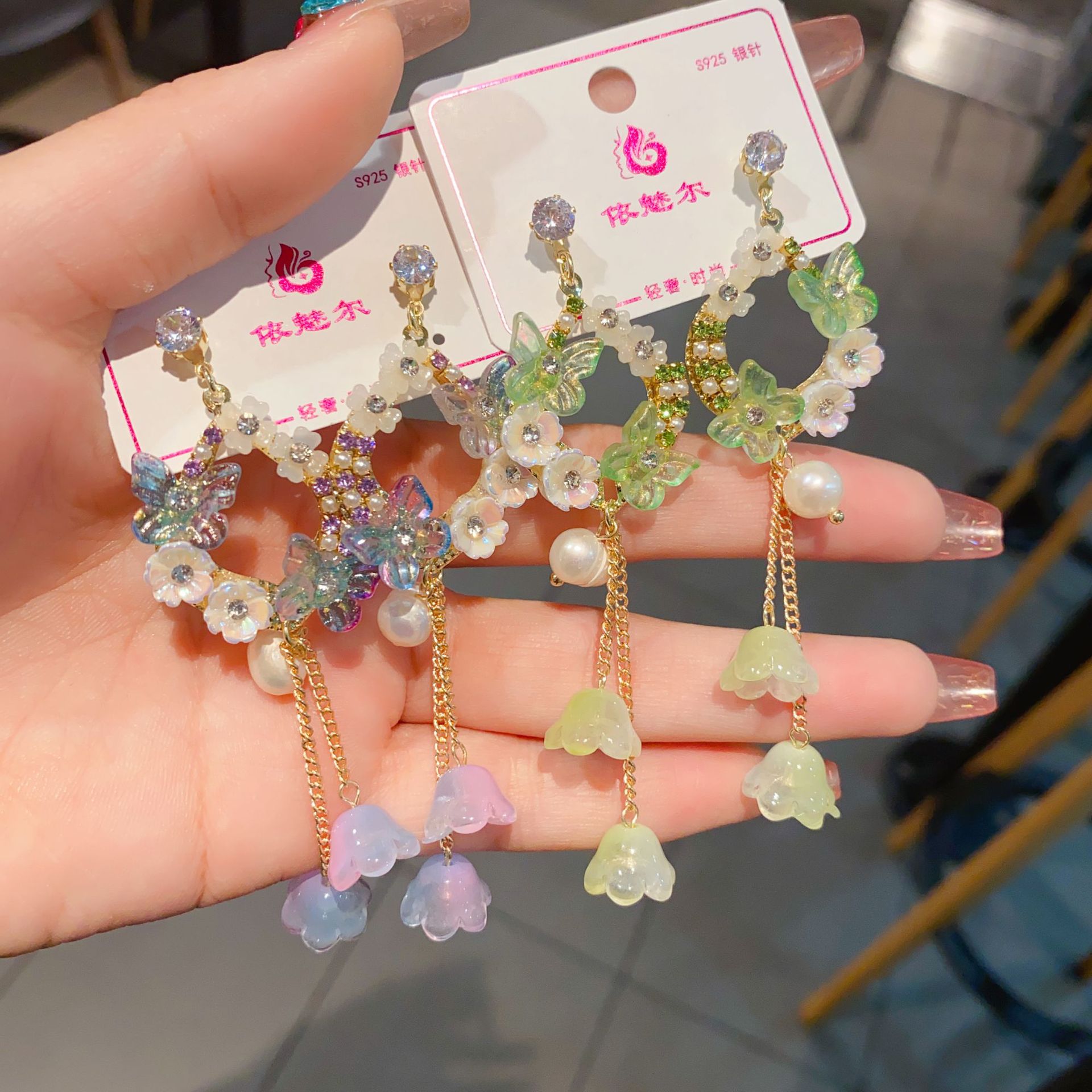 Japanese and Korean style fresh geometric design flower crystal tassel silver needle sweet handmade Korean style fashion niche earrings