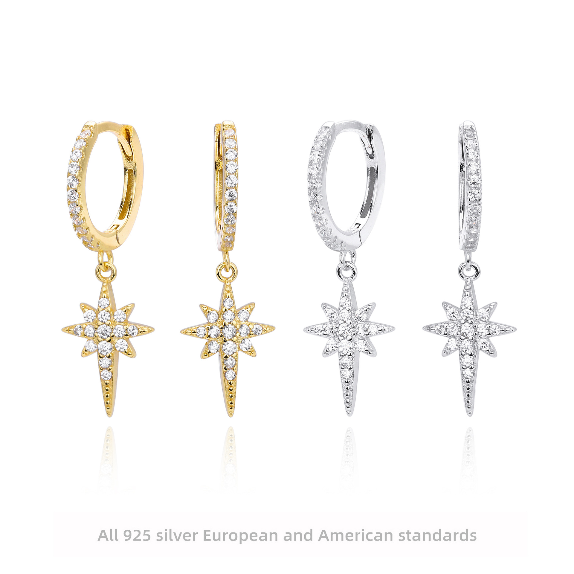 European, American, Japanese, and Korean Women's Light Luxury S925 Sterling Silver Micro-Inlaid Zircon Eight-Pointed Star Earrings, Fashionable Versatile Cute Hoop Earrings
