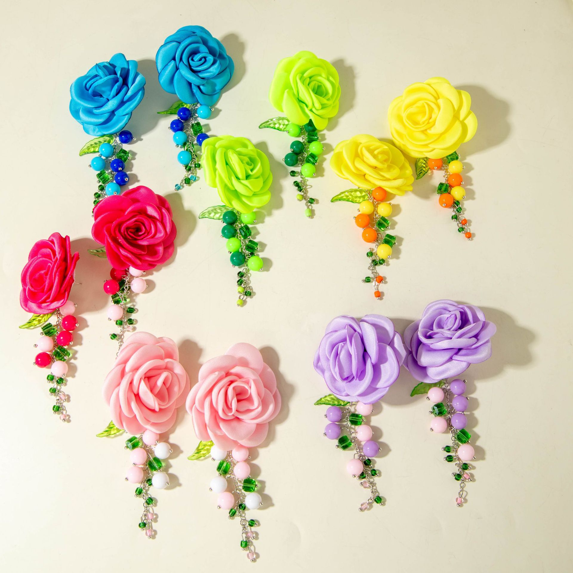 European and American Cross-Border Jewelry Fashionable Sweet Stereo Fabric Long Rice Beads Tassel Tulip Flower Earrings