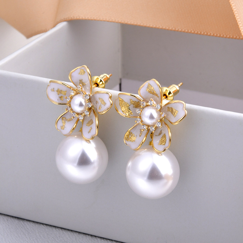 Korean style spring and summer pastoral style Mori gold foil Camellia pearl earrings fresh sweet personality fashion earrings earrings earrings