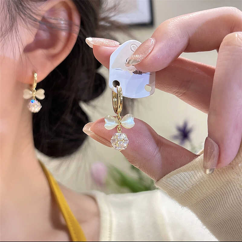 Sweet Cat's Eye Bow Zircon Ball Earrings, Light Luxury, Niche Design, Versatile Ladylike Style Earrings
