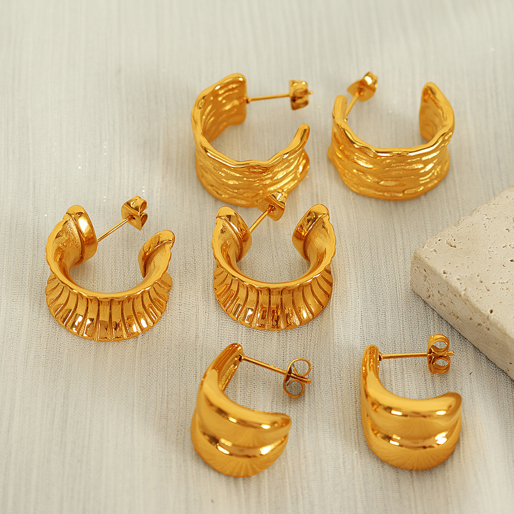 French 18K Pleated Texture Strip Water Drop Earrings Titanium Steel Earrings European and American C- Type Advanced Sense Wholesale Girls