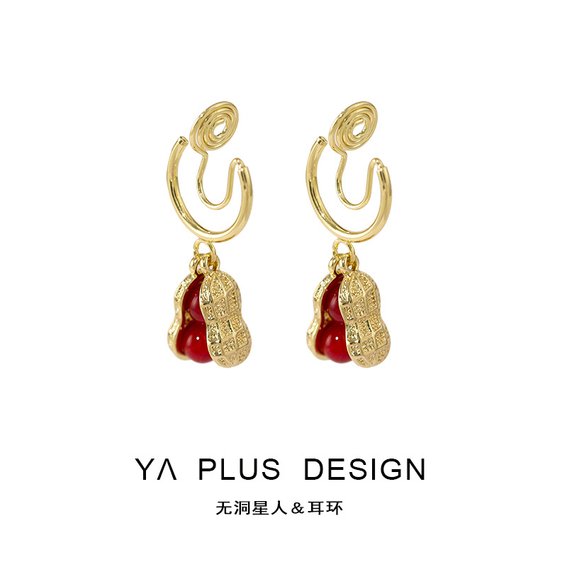 Light Luxury noble golden peanut earrings elegant high-grade Red Pearl trendy mosquito coil ear clip without pierced women