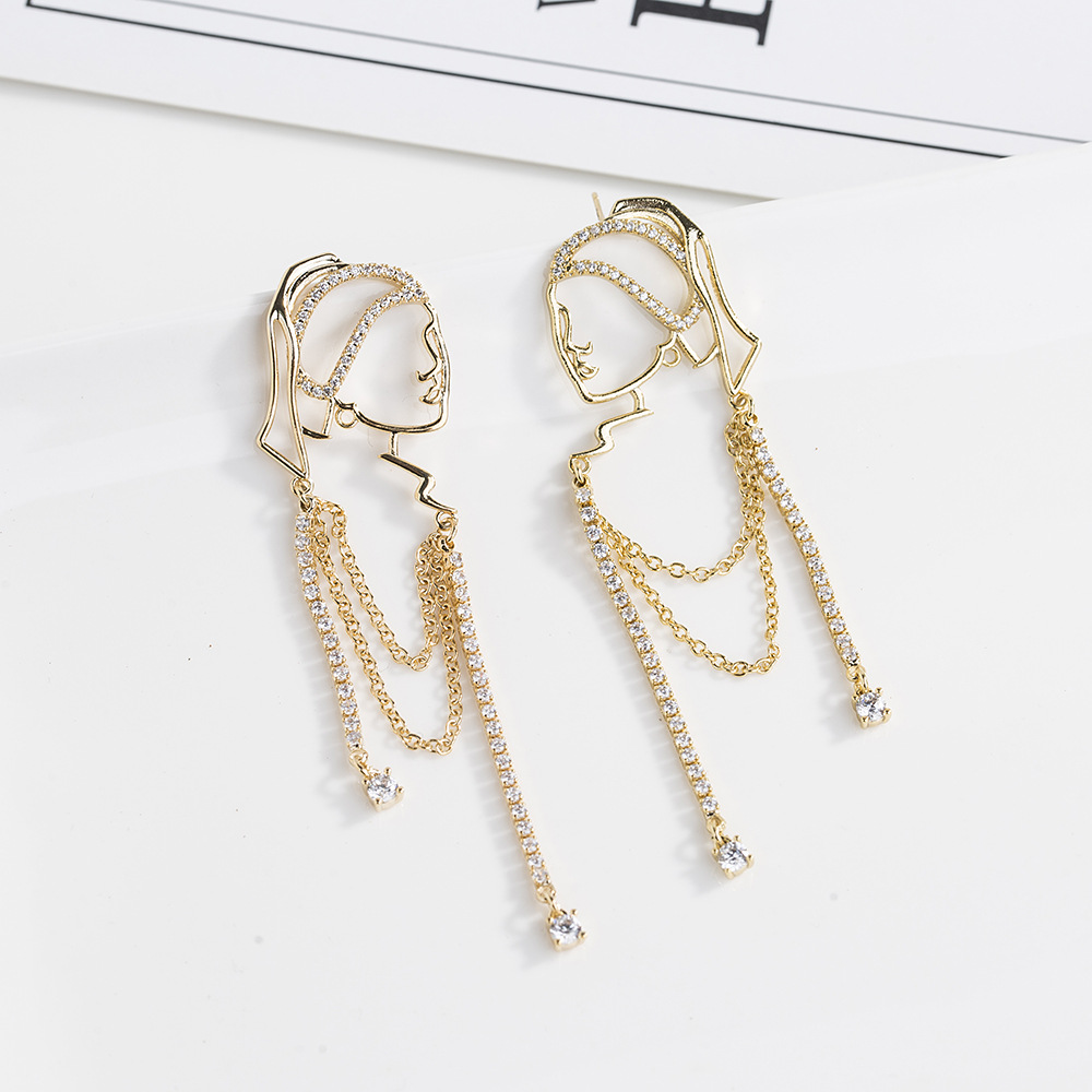 Japanese and Korean style earrings creative abstract girl head earrings s925 silver needle socialite personality Net red tassel earrings
