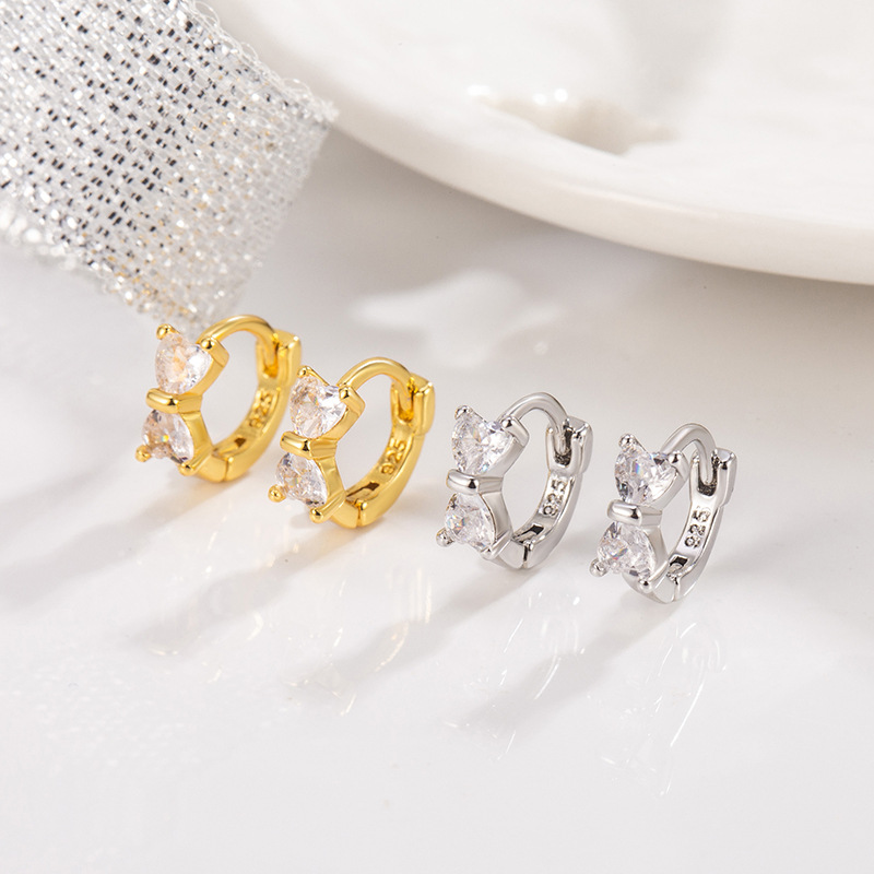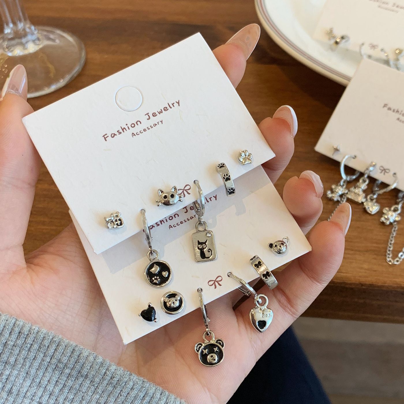 Sweet Cool Black Panda Cat Ear Buckle suit Women's Small and Exquisite Cartoon Stacked Small Circle Earrings silver Earrings