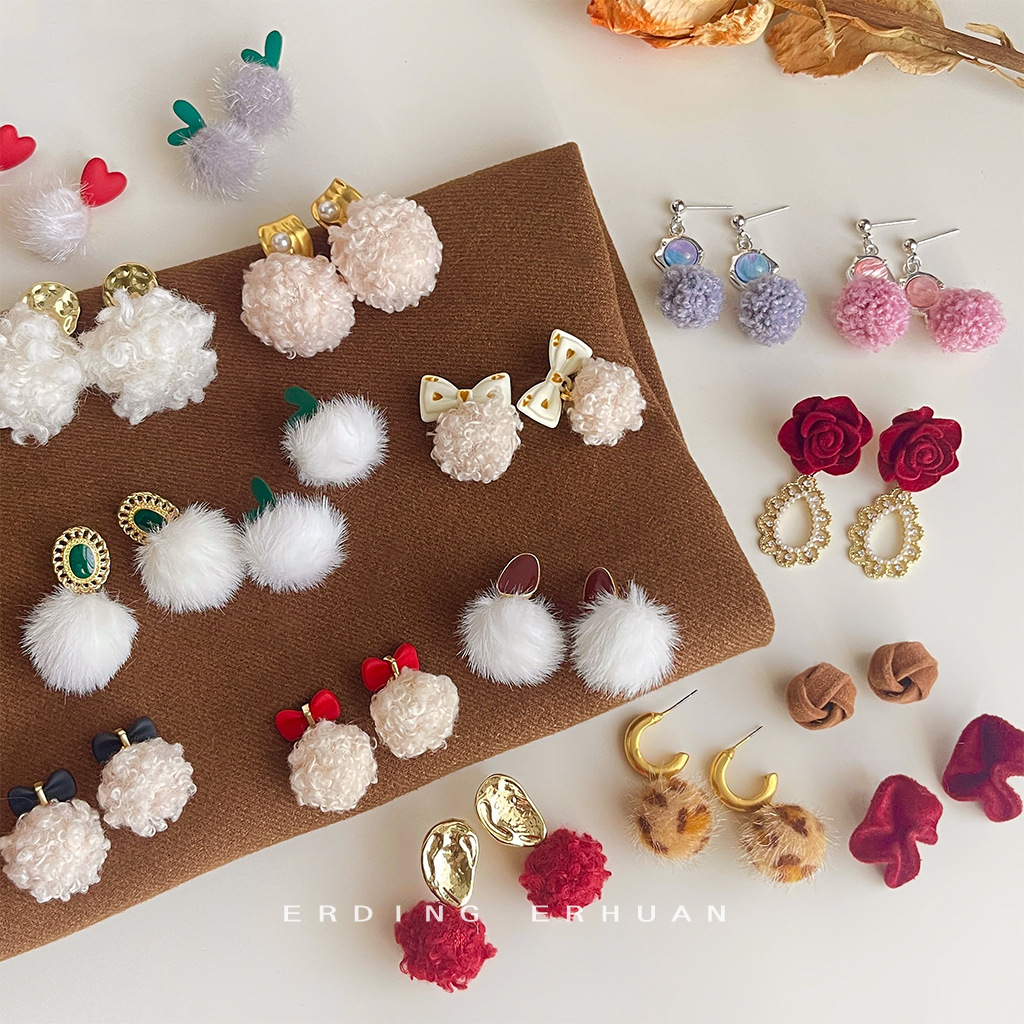 Autumn and Winter Sweet Hair Ball Earrings Design Hand-made Cute Bow Plush High-grade Touchability Elegant Earrings for Women