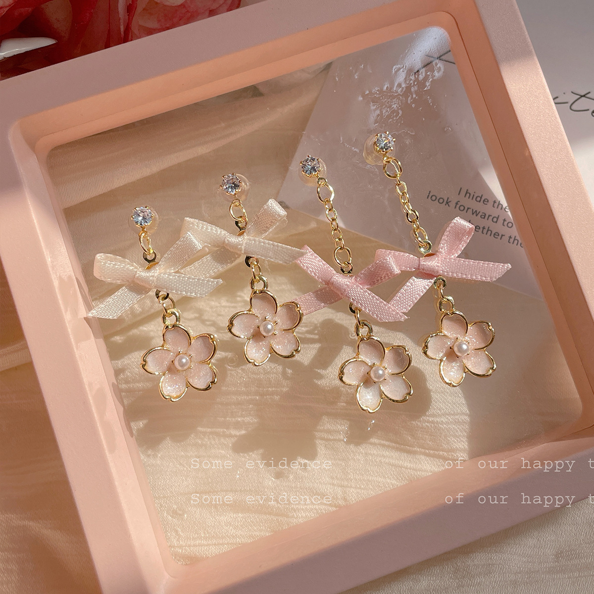 Summer Pink Fabric Bow Cherry Blossom Earrings Pendant Women's Silver Needle Sweet Girl's Heart Super Fairy Fresh Earrings