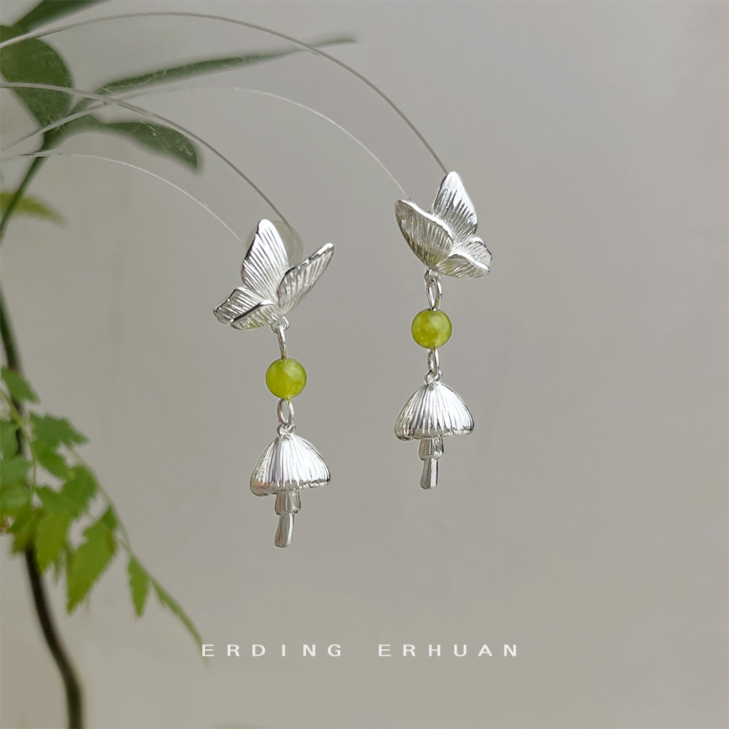 Designer Style ~ Forest Style Small Fresh Sweet Cute Butterfly Mushroom Natural Stone Earrings 925 Silver Needle Earrings for Women