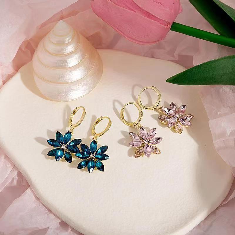 European and American fashion girl double-layer set crystal four-color petals romantic earrings earrings earrings rotatable small fresh earrings