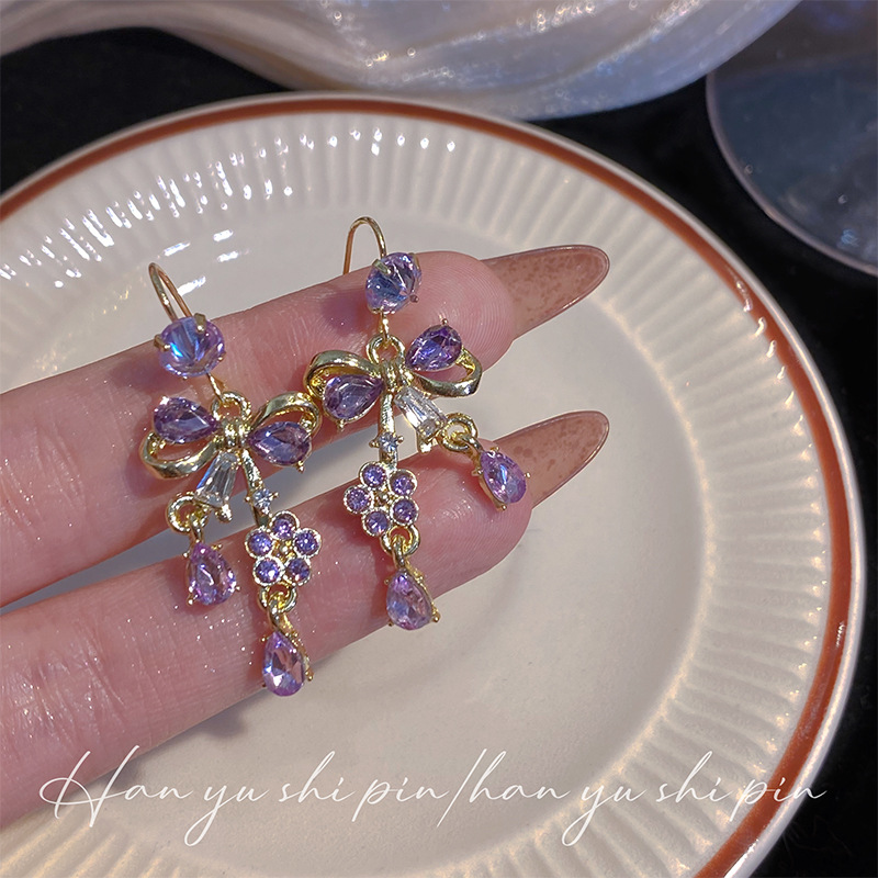 Light Luxury Niche Fairy Purple Bow Tassel Earrings Exquisite High-end Sense Elegant Sweet Korean Style All-match Earrings