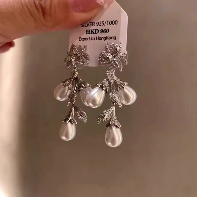 French-Style Light Luxury Gold Leaf Earrings for Women, Fashionable High-End Sweet Versatile Long Pearl Flower Drop Earrings