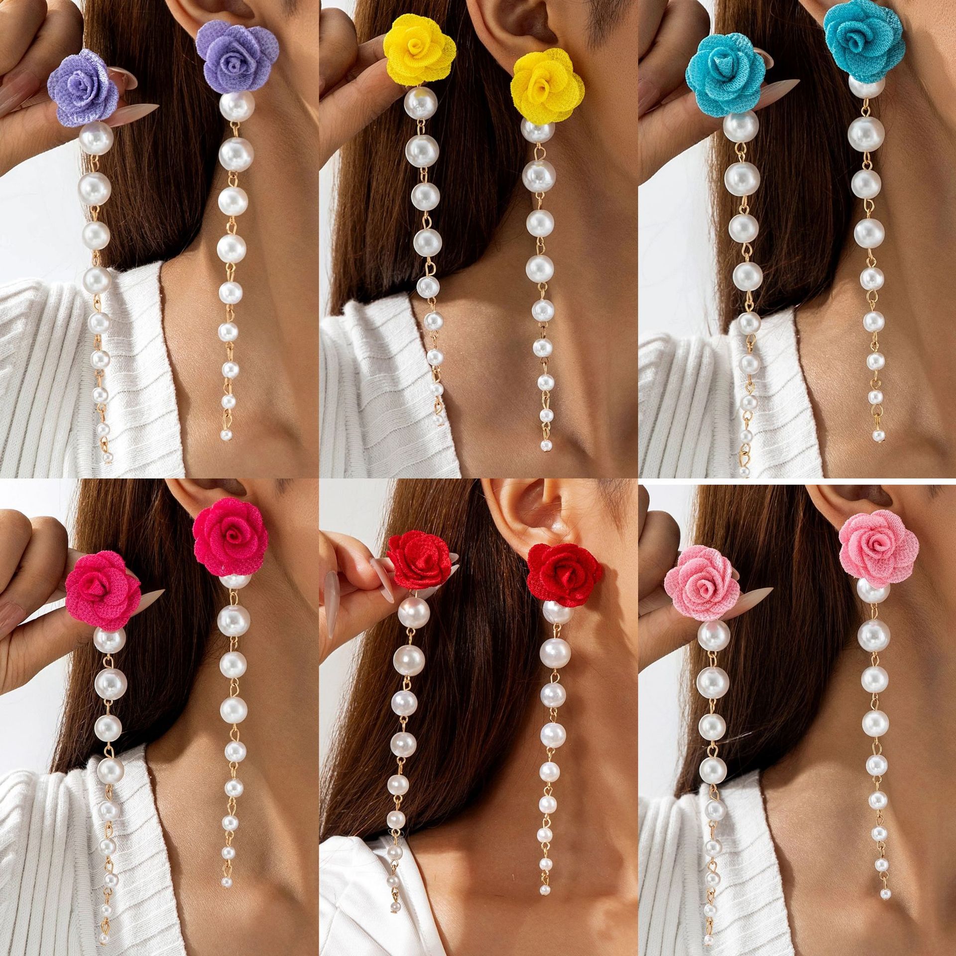 European and American Cross-Border Fresh Fabric Colorful Pearl Earrings Sweet Rice Beads Tassel Tulip Flower Earrings