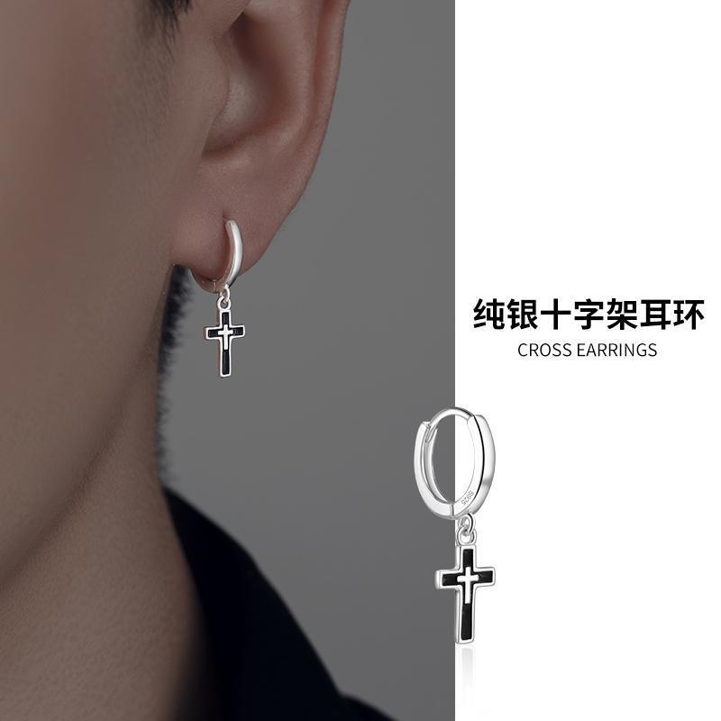 Sterling Silver Earrings Men's High-end Simple Black Cross Earrings Single Cold Style Trendy Brand All-match Men's Earrings