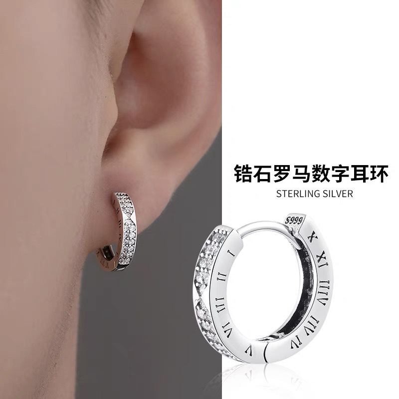 S999 Sterling Silver Roman Digit Earrings Simple Diamond Circle Earrings Men's Ear Buckle Light Luxury Retro Neutral Earrings