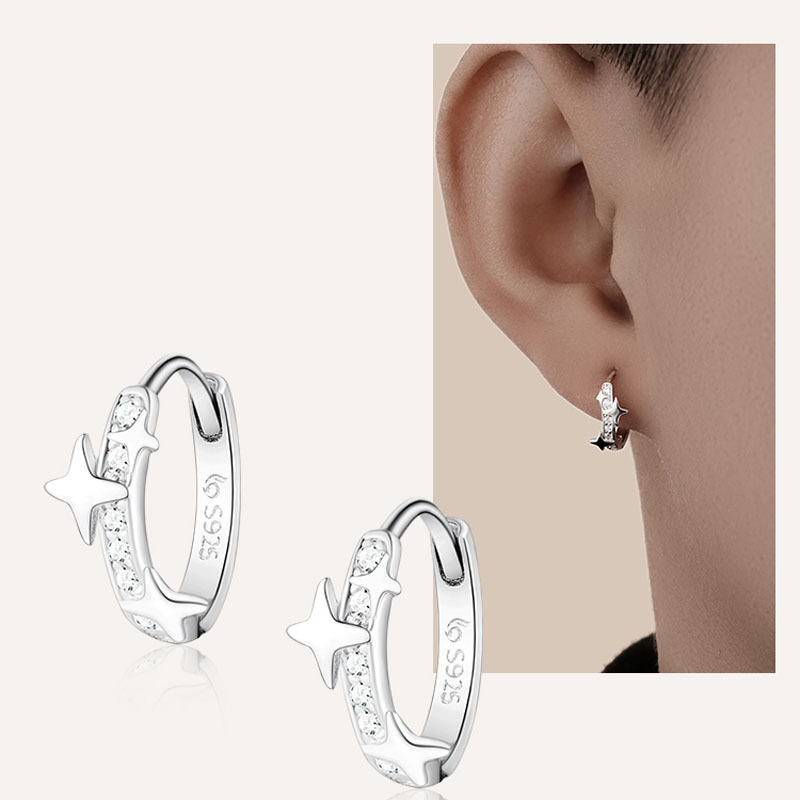 Neutral cold and clear cross four-star Awn zircon ear buckle men's design simple cool handsome row Diamond Star ear ring earrings