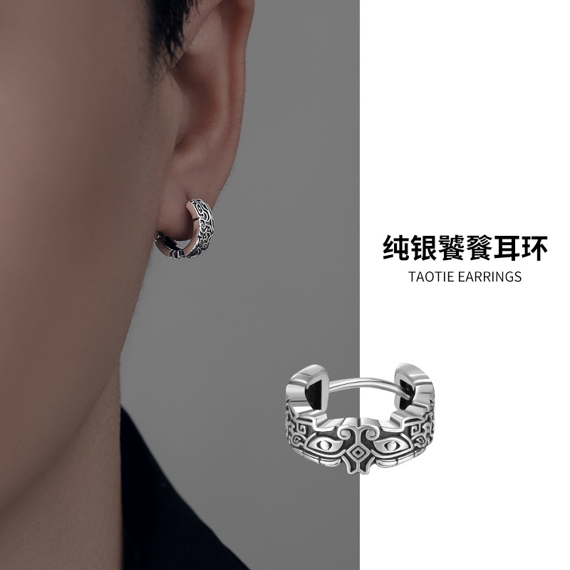 Silver-plated earrings men's high-grade retro distressed ancient totem circle personality single sleep-free boys ear buckle