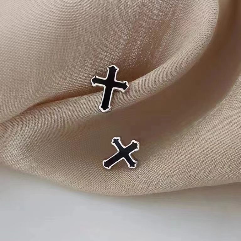 925 Silver Earrings Black Cross Men's Simple Men's and Women's Accessible Luxury Niche Trendy Earrings