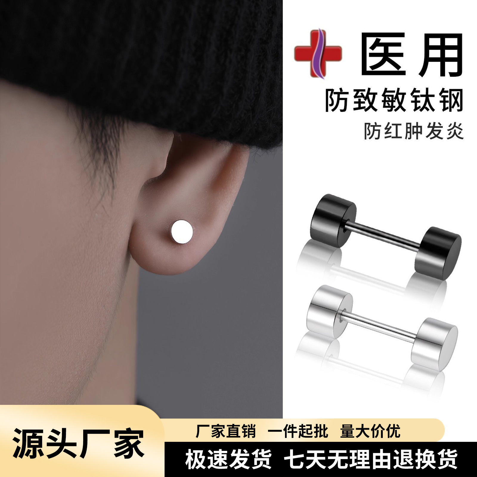 Cross-border explosives titanium steel black barbell earrings hip-hop rock round hipster dumbbell screws non-allergic earrings