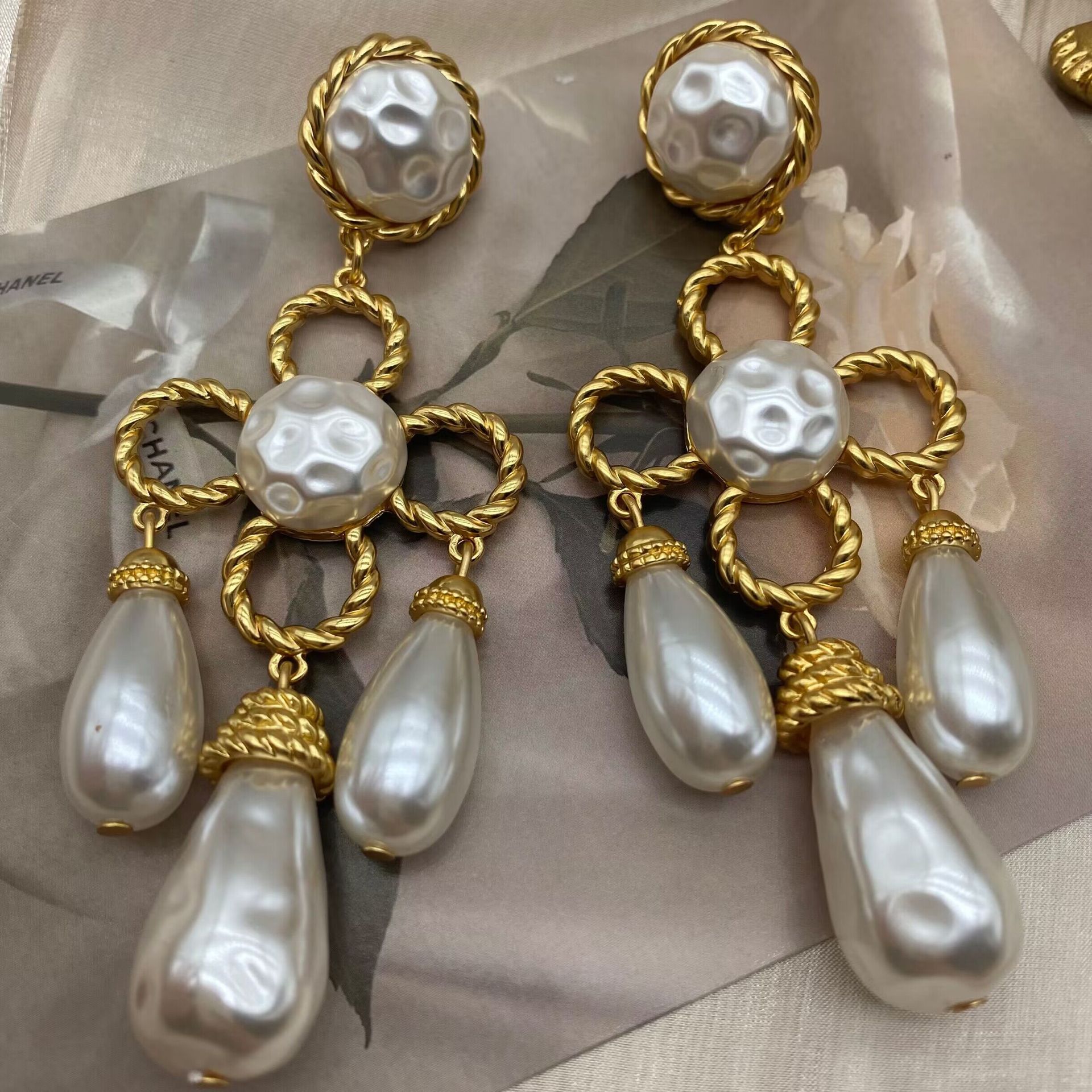 Middle Ancient vintage Western Electroplated Real Gold Shoulder Swept Pearl Four-leaf Clover Flower Braided 925 Silver Needle Stud Earrings