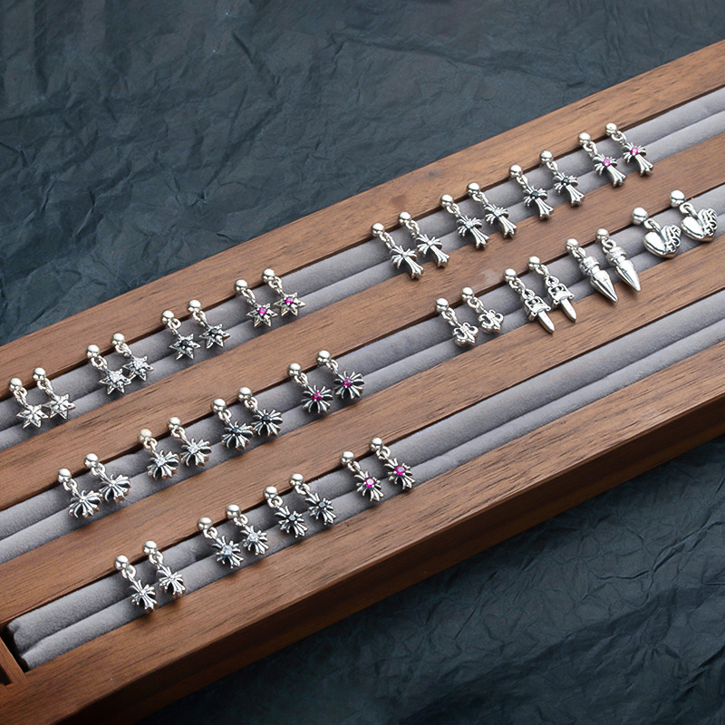 Thai silver distressed small cross earrings female S925 sterling silver earrings couple punk trendy handmade inlaid stone earrings male