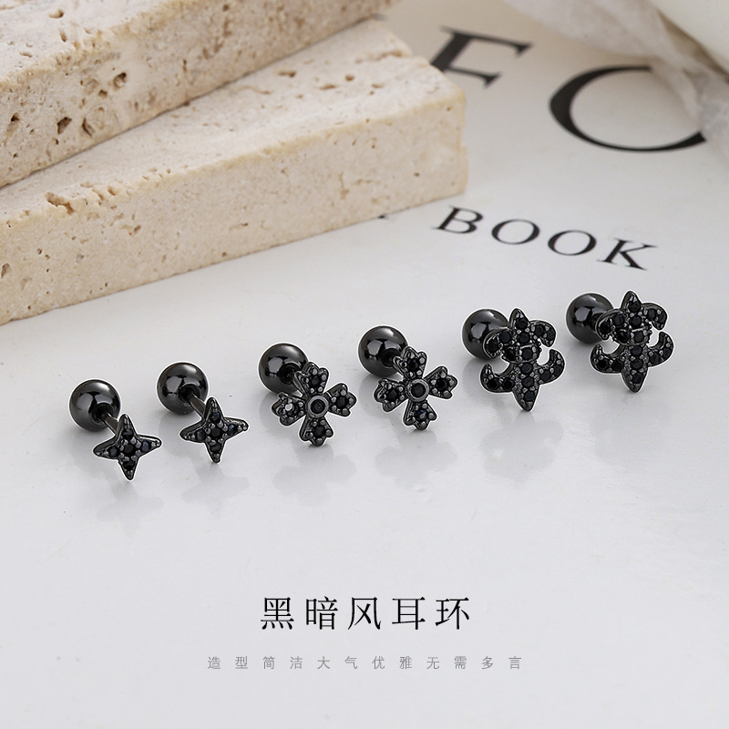 Dark Style Personalized INS Anchor Star Black Thread Earrings Simple Ear Nail Screw Jewelry for Boys and Girls