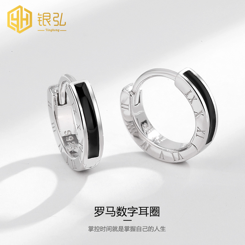 S925 Sterling Silver Roman Numerals Ear Ring Ear Buckle Men's High Sense Boyfriend Style Black Glue Drop Earrings Accessories
