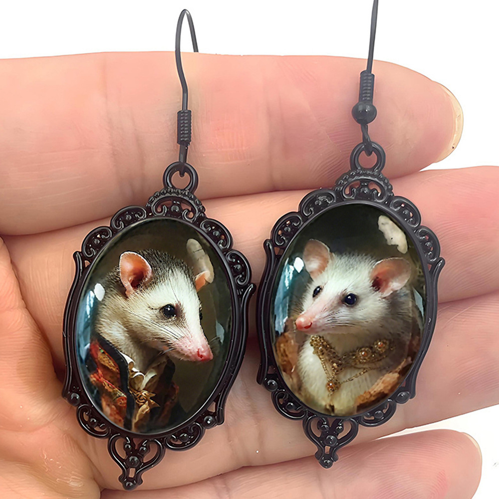Creative Asymmetrical Matching Opossum Earrings for Women and Men Gothic Oval Time Gemstone Glass Drop Earrings