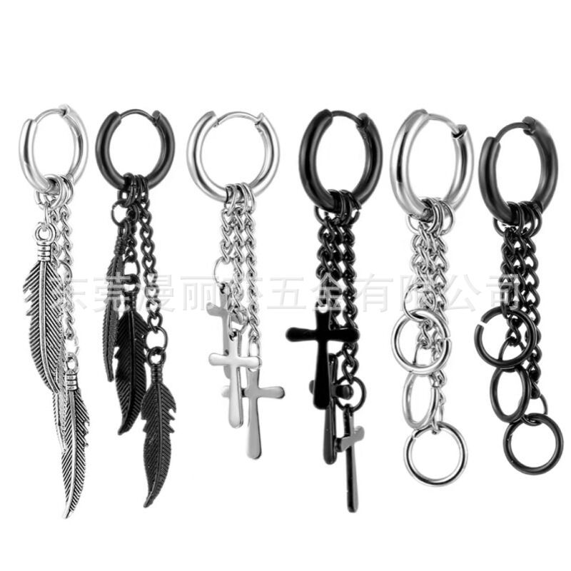 Cross-border tassel chain Feather titanium steel coil earrings stainless steel ear bone buckle Korean style men's hip hop ear jewelry