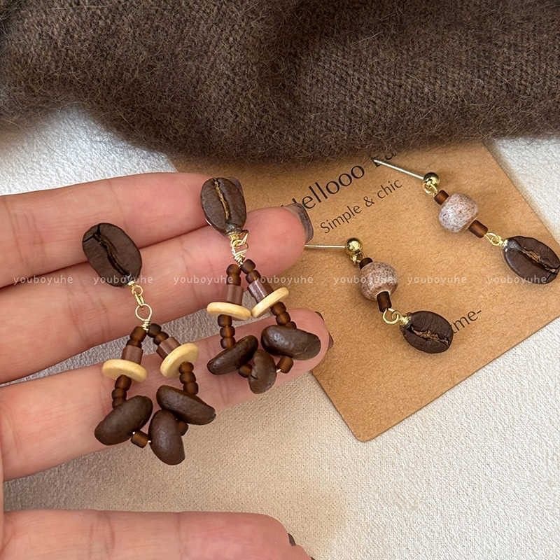 Vintage Artistic Original Design Coffee Bean Earrings Women's Irregular Wooden Beaded New Chinese Ethnic Style Earrings