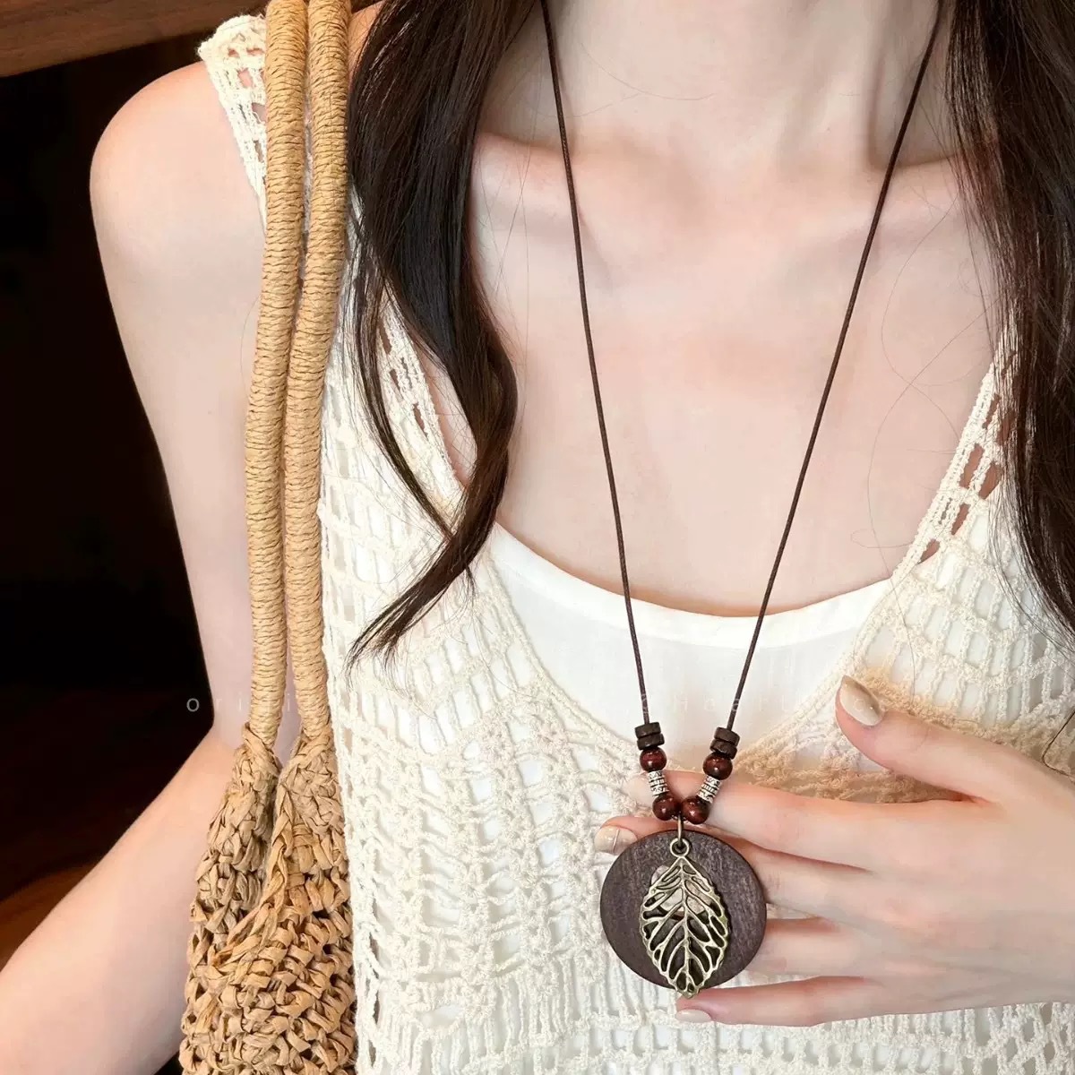 Ethnic Style Handmade Leaf Round Wood Necklace Women's Literary Retro Long Sweater Chain Cotton and Linen Clothing Small Accessories Pendant