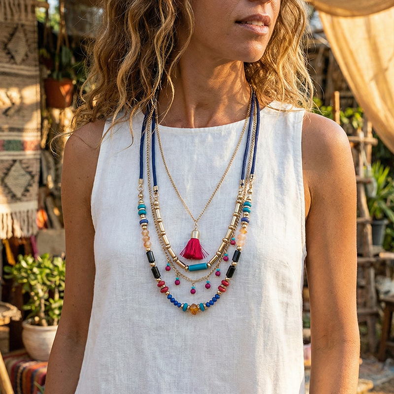 Cross-Border Hot-Selling Bohemian Fashion Ethnic Style Multi-Layered Rice Bead Chain Necklace Tassel Pendant Holiday Necklace for Women
