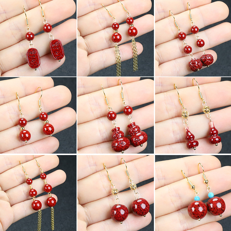 [supply chain] natural cinnabar earrings grain crystal sand gold gourd earrings birthday gift